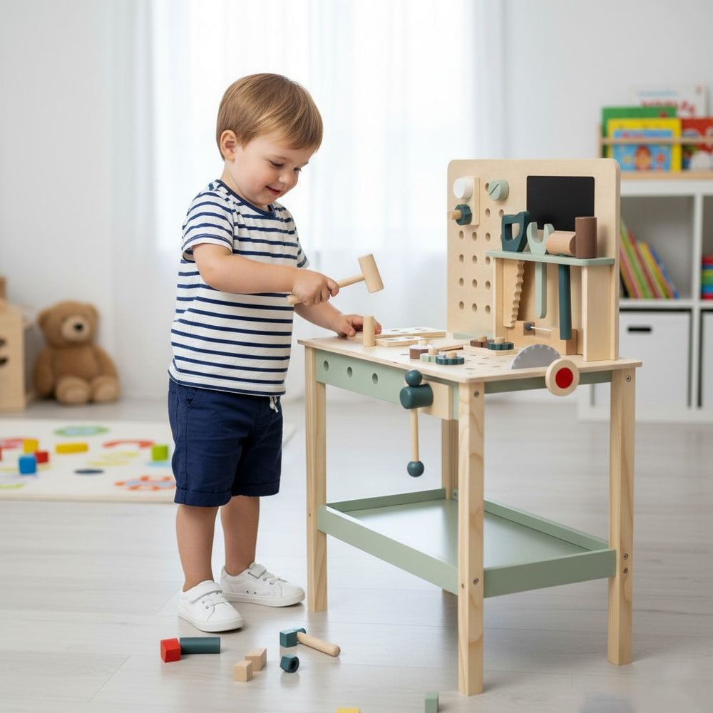 Bancul de lucru Bolt, de la Atmosphera, este identic cu un banc de lucru real pentru adulți. Acesta conține toate instrumentele necesare pentru a face meseriile la care visează micuțul tău: nivela, șurubelniță, echer, ciocan, cheie fixă, fierăstrău, roți dințate, șuruburi... Copilul tău se va simți ca un adevărat meșter și își va dezvolta abilitățile motorii. Bancul de lucru măsoară 75,5 cm înălțime, fiind ideal pentru toți copiii cu vârsta de 3 ani și peste.