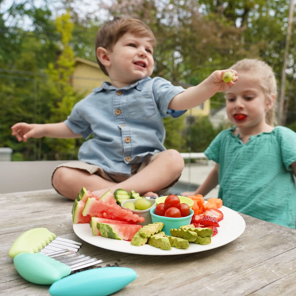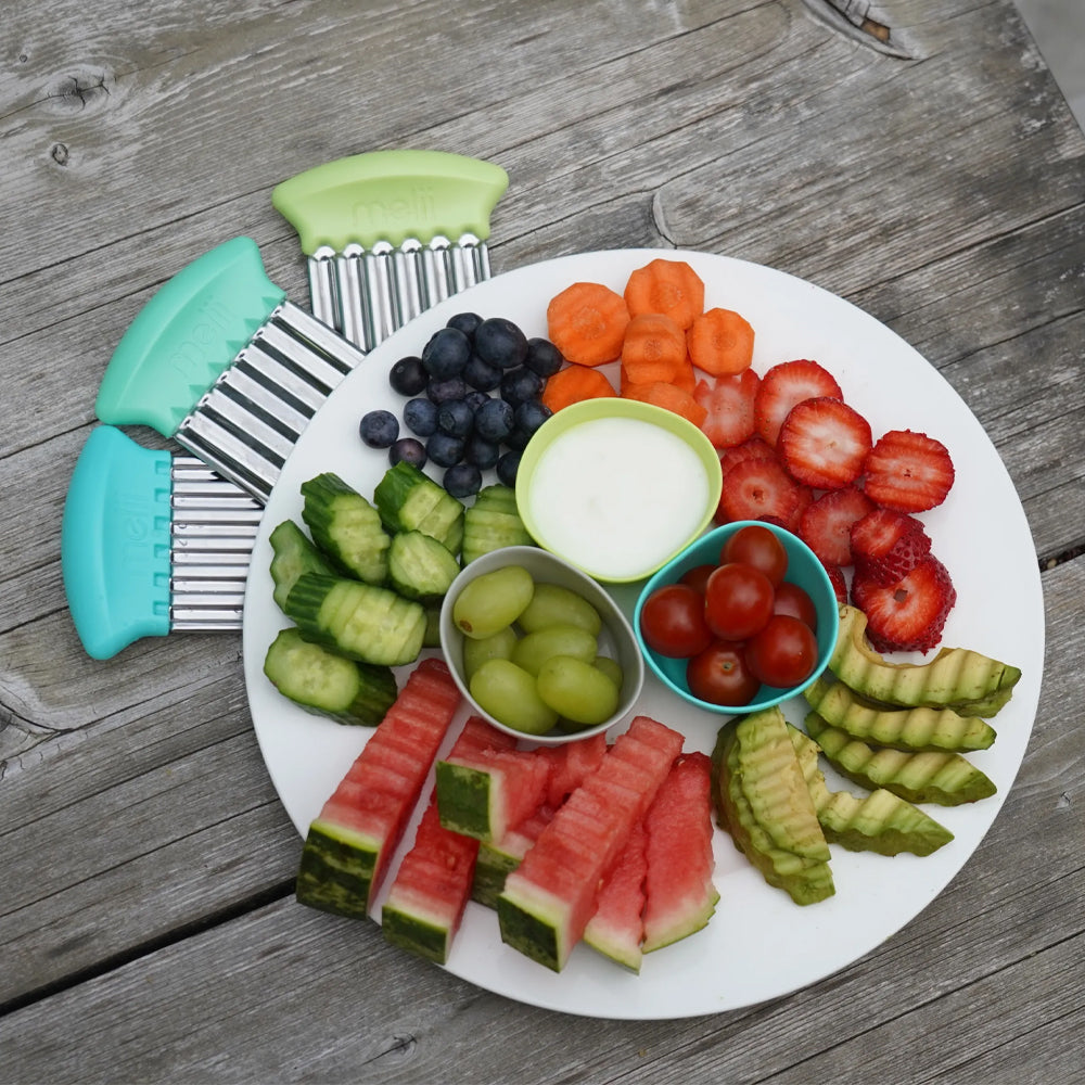 Taie si decoreaza gustarile cu usurinta cu cutitele pentru gustari copii Melii! Manerele ergonomice permit felieri si tocari fara efort ale legumelor, fructelor si altor alimente, transformand mesele intr-o adevarata distractie. Creeaza rapid cartofi pai ondulati, salate, sandvisuri, branzeturi, biscuiti, legume, fructe si multe altele!