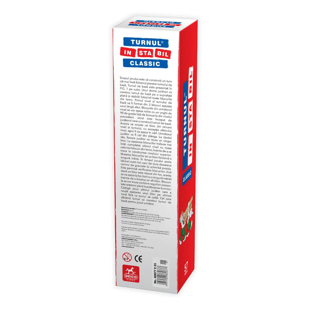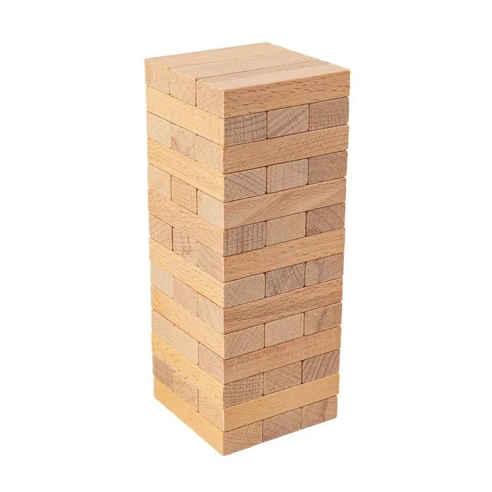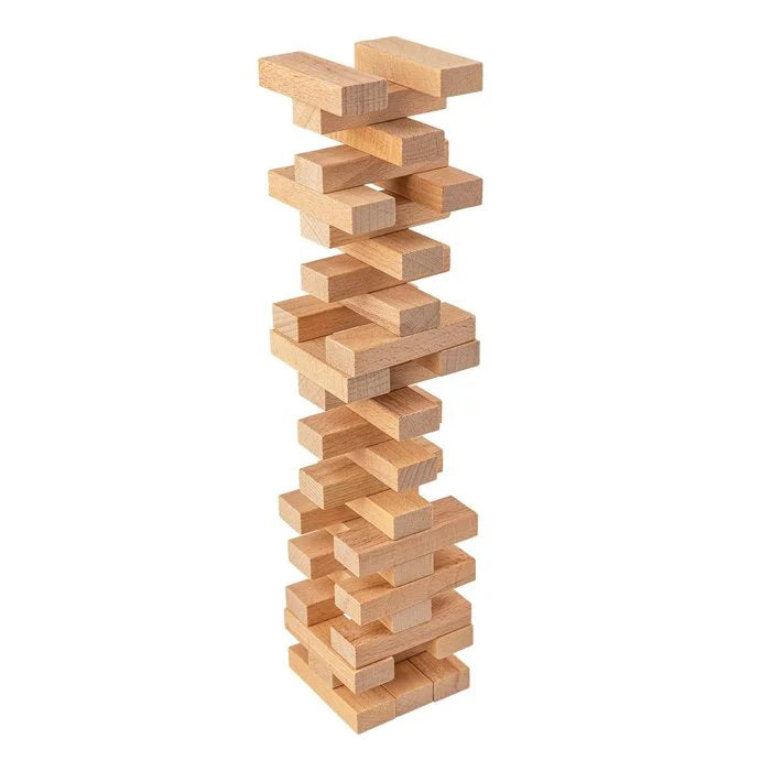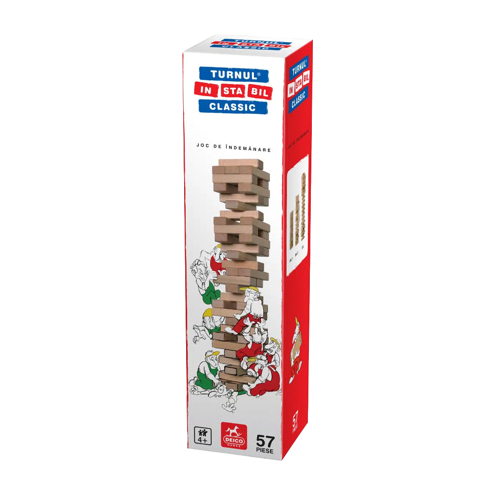 Construiți împreună turnul cu ajutorul celor 57 de piese din lemn și apoi trageți pe rând, cu grijă, fiecare piesă, pentru ca turnul să nu se prăbușească. Fiecare mutare duce la schimbarea centrului de greutate și afectează echilibrul turnului, astfel că el devine tot mai instabil. Oare la cine o să cadă în final?